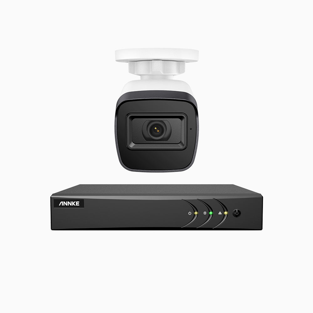 EL200 - Kit de 1 cámaras de vigilancia 1080p con grabador de 4 canales, DVR inteligente con detección de humanos y vehículos, visión nocturna por infrarrojos de 20 metros, señal de salida 4-en-1, IP67
