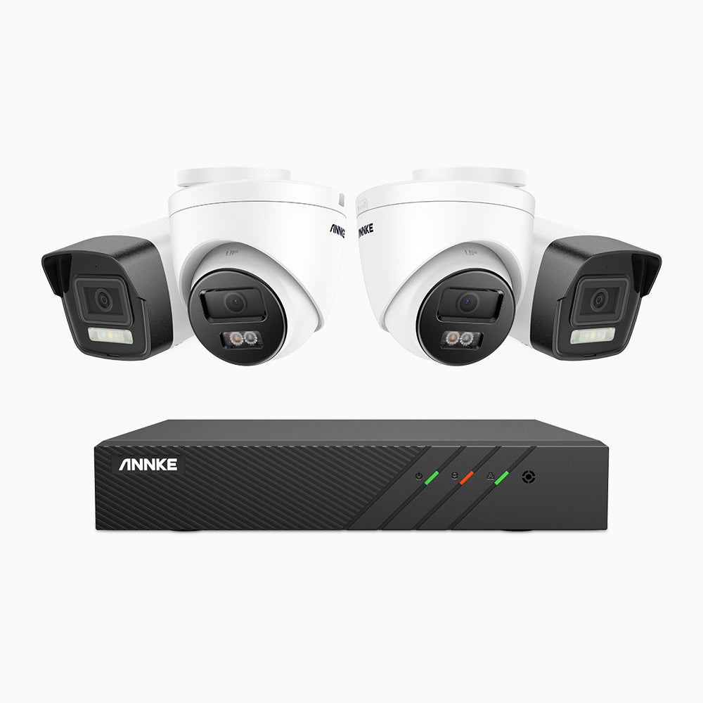 H500P - Kit de vigilancia PoE de 3K con 2 cámara bullet y 2 cámara domo y videograbador NVR de 8 canales, Resolución 3072*1728, Apertura f / 1.6 (0.005 Lux), Detección de humanos y vehículos, Micrófono incorporado, IP67