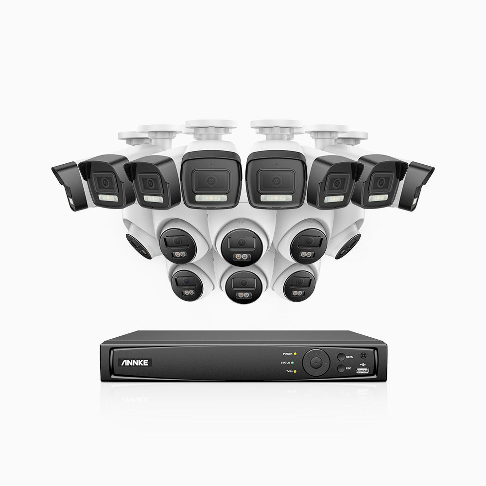 H500P - Kit de vigilancia PoE de 3K con 8 cámara bullet y 8 cámara domo y videograbador NVR de 16 canales, Resolución 3072*1728, Apertura f / 1.6 (0.005 Lux), Detección de humanos y vehículos, Micrófono incorporado, IP67