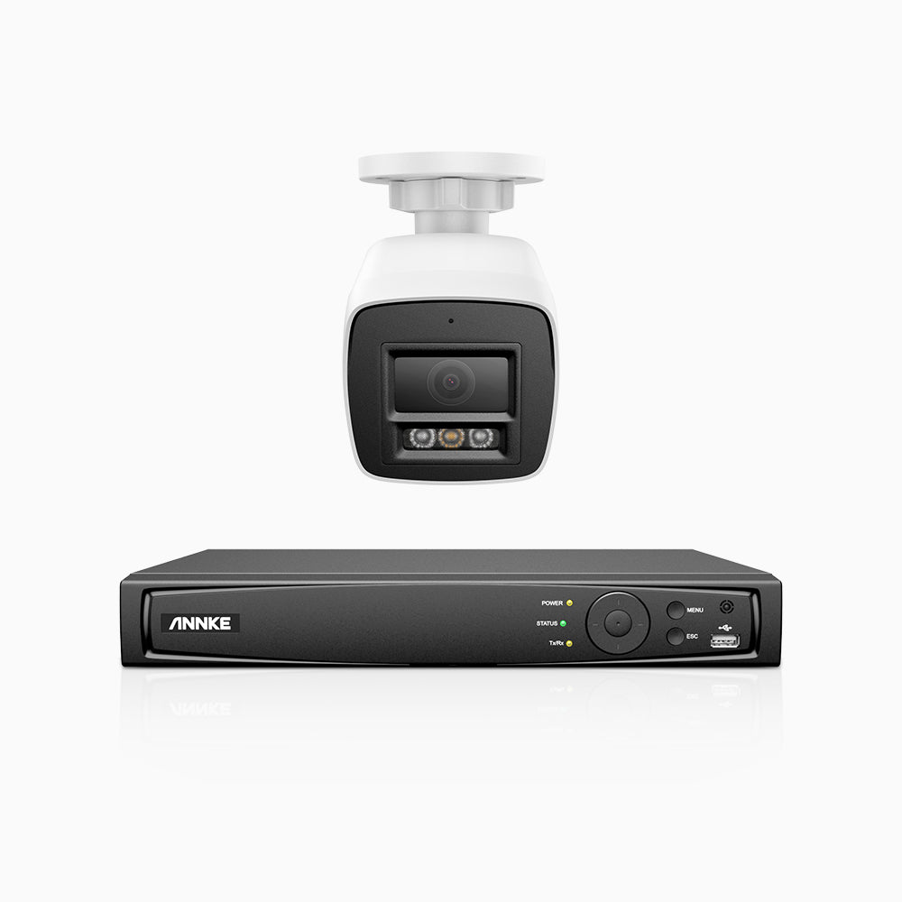 H800 - Kit de 1 cámara de vigilancia PoE de 4K con videograbador NVR de 4 canales, Visión nocturna a color e infrarrojos, detección de humanos y vehículos, micrófono integrado, ángulo de visión 96º