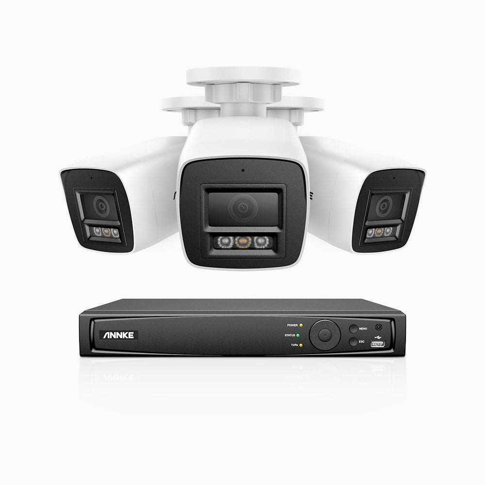 H800 - Kit de 3 cámaras de vigilancia PoE de 4K con videograbador NVR de 4 canales, Visión nocturna a color e infrarrojos, detección de humanos y vehículos, micrófono integrado, ángulo de visión 96º