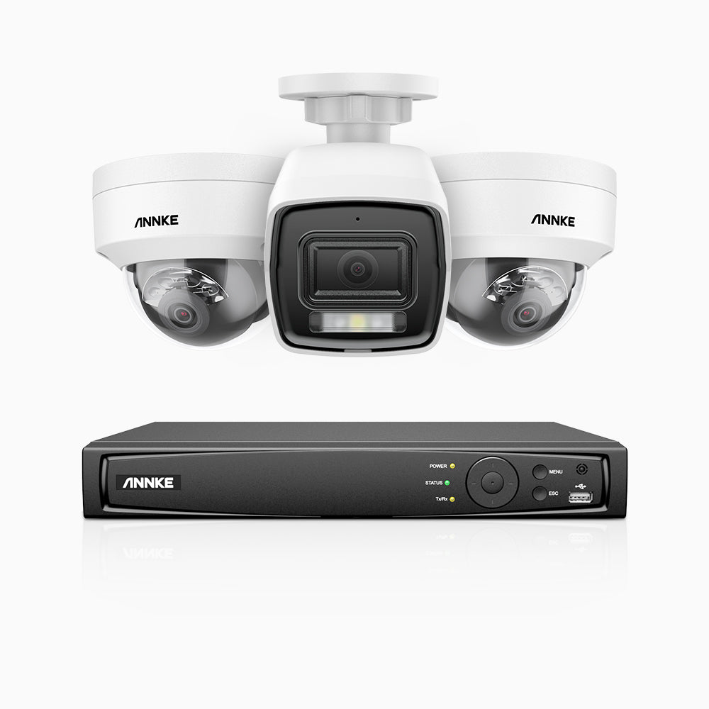 H800 - Kit de vigilancia PoE 4K con 1 cámara bullet y 2 cámara domo (antivándalica IK10) y videograbador NVR de 4 canales, Visión nocturna a color e infrarrojos, detección de humanos y vehículos, micrófono integrado, ángulo de visión 96º
