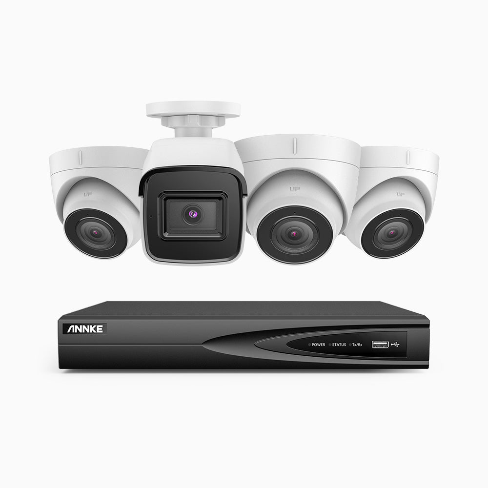 H800 - Kit de vigilancia PoE 4K con 1 cámara bullet y 3 cámara domo y videograbador NVR de 4 canales, Visión nocturna a color e infrarrojos, detección de humanos y vehículos, micrófono integrado, ángulo de visión 96º
