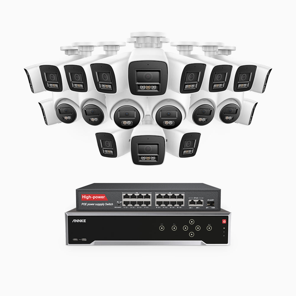 H800 - Kit de vigilancia PoE 4K con 14 cámaras bullet y 6 cámaras domo y videograbador NVR de 32 canales, Visión nocturna a color e infrarrojos, detección de humanos y vehículos, micrófono integrado, ángulo de visión 96º
