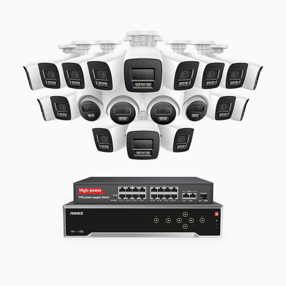 H800 - Kit de vigilancia PoE 4K con 16 cámaras bullet y 4 cámaras domo y videograbador NVR de 32 canales, Visión nocturna a color e infrarrojos, detección de humanos y vehículos, micrófono integrado, ángulo de visión 96º