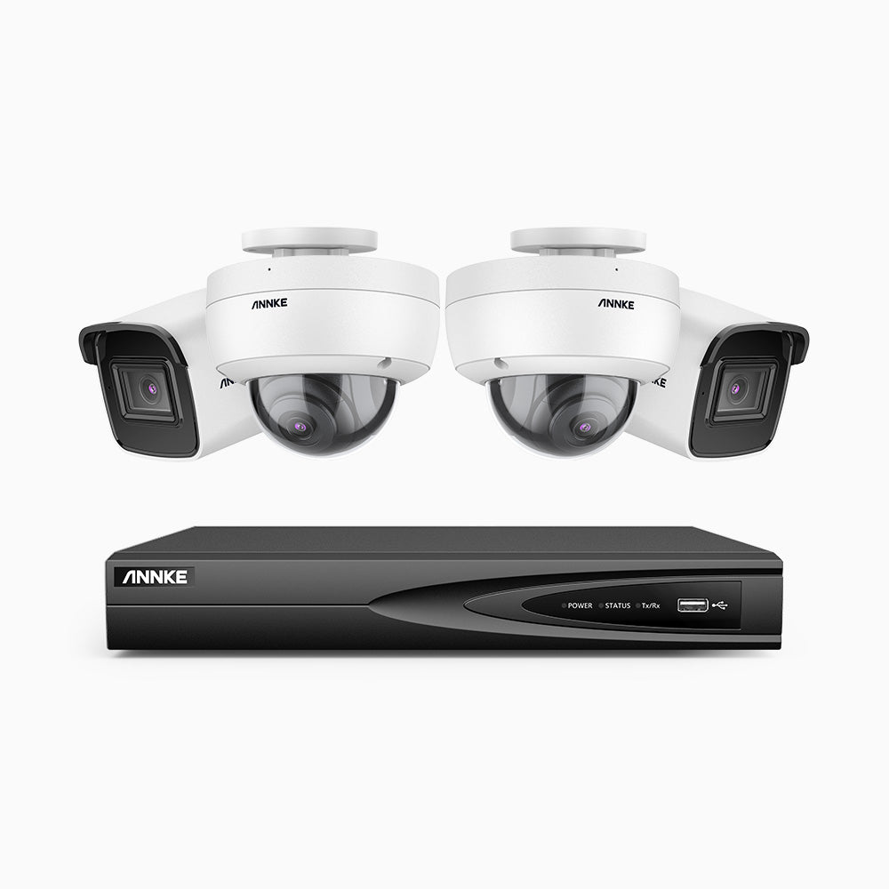 H800 - Kit de vigilancia PoE 4K con 2 cámaras bullet y 2 cámaras domo (antivándalica IK10) y videograbador NVR de 8 canales, Visión nocturna a color e infrarrojos, detección de humanos y vehículos, micrófono integrado, ángulo de visión 96º