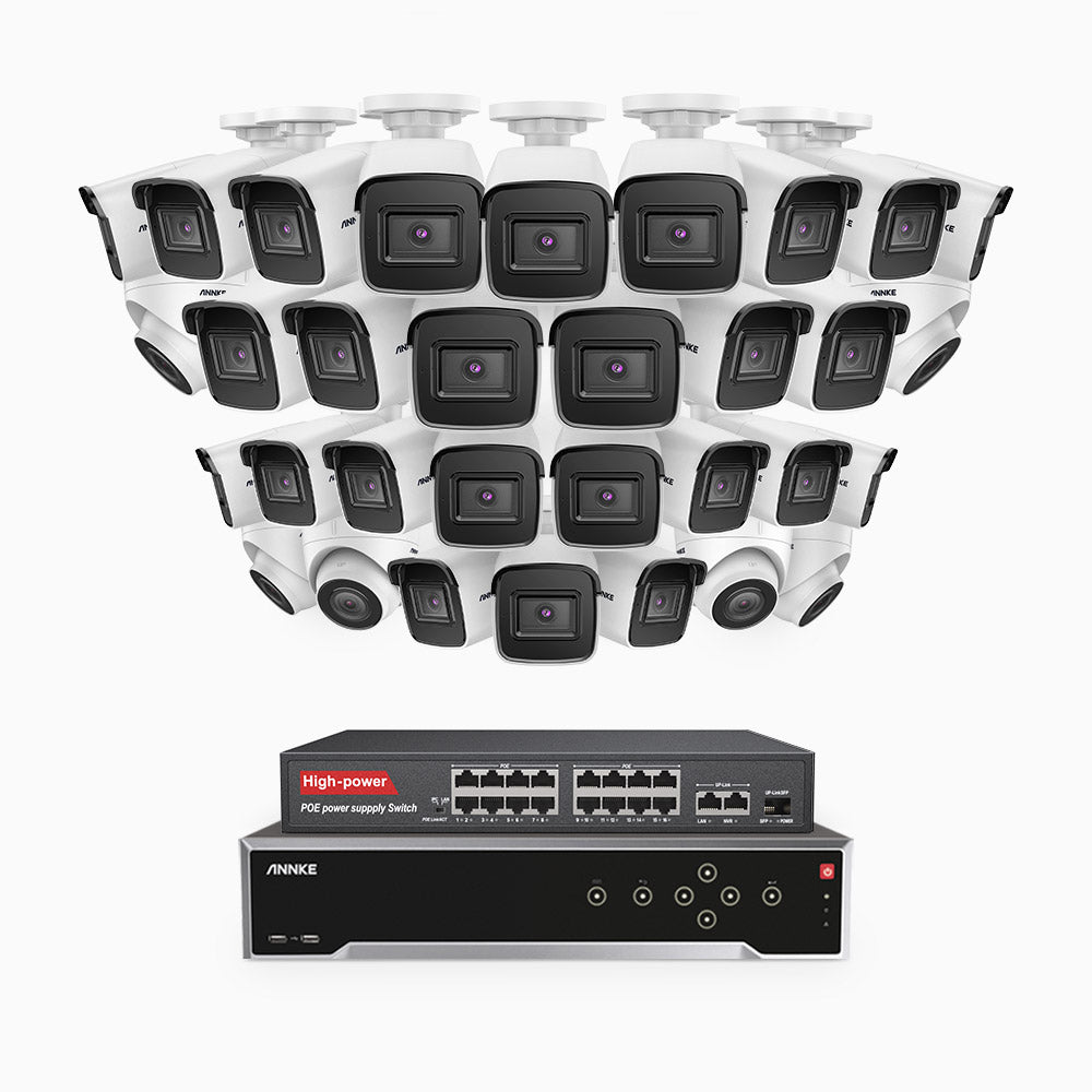 H800 - Kit de vigilancia PoE 4K con 26 cámaras bullet y 6 cámaras domo y videograbador NVR de 32 canales, Visión nocturna a color e infrarrojos, detección de humanos y vehículos, micrófono integrado, ángulo de visión 96º