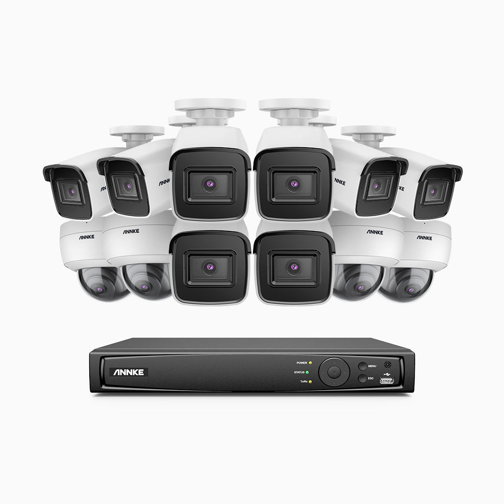 H800 - Kit de vigilancia PoE 4K con 8 cámaras bullet y 4 cámaras domo (antivándalica IK10) y videograbador NVR de 16 canales, Visión nocturna a color e infrarrojos, detección de humanos y vehículos, micrófono integrado, ángulo de visión 96º
