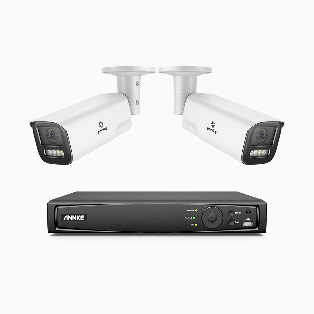 HZ804 - Kit de 2 cámaras de vigilancia PoE de 4K con videograbador NVR de 8 canales, zoom óptico 4X, doble luz visión nocturna, detección de movimiento 2.0, Micrófono incorporado, alarma de sirena y estroboscópica