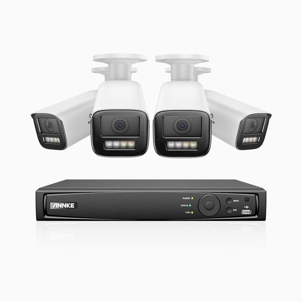 HZ804 - Kit de 4 cámaras de vigilancia PoE de 4K con videograbador NVR de 4 canales, zoom óptico 4X, doble luz visión nocturna, detección de movimiento 2.0, Micrófono incorporado, alarma de sirena y estroboscópica